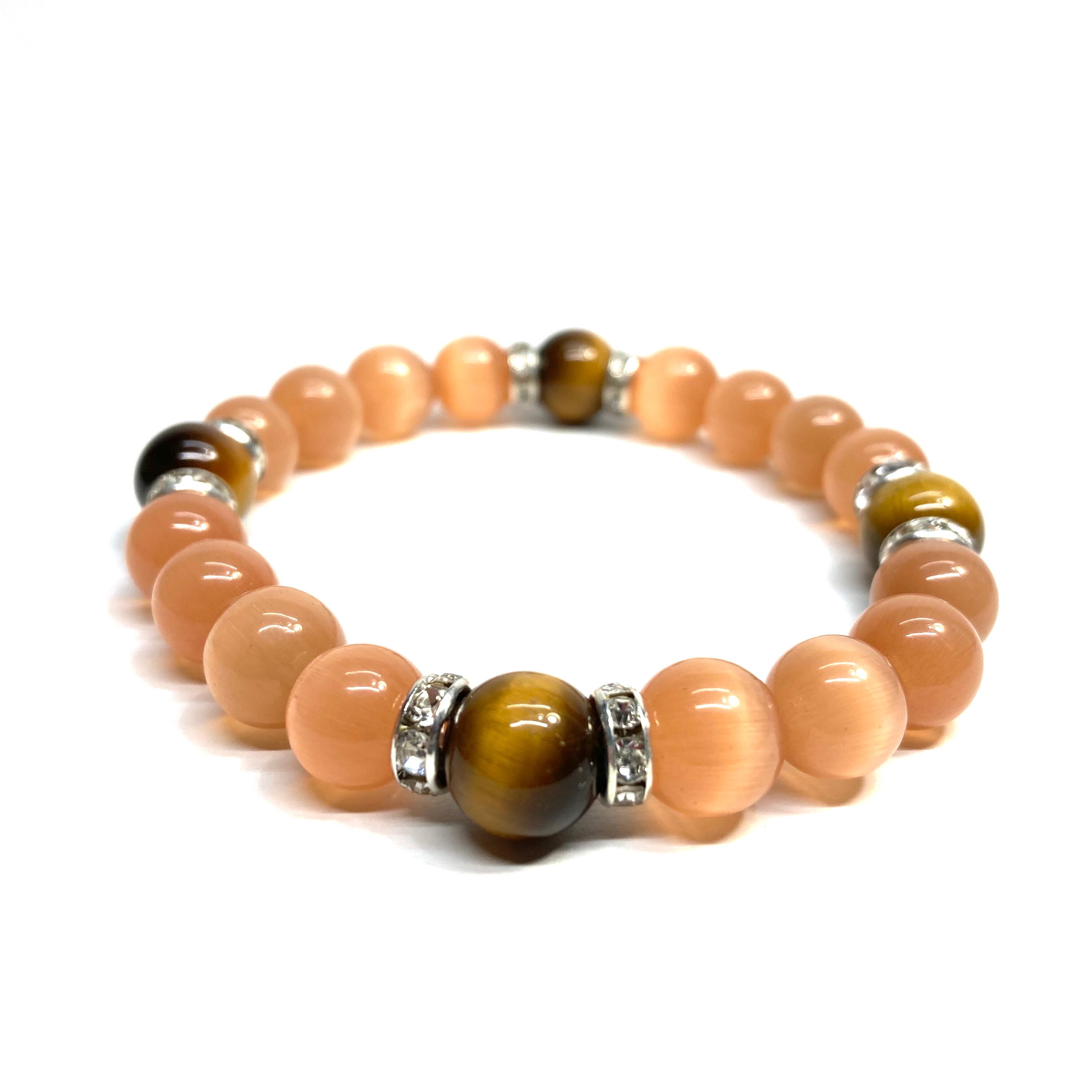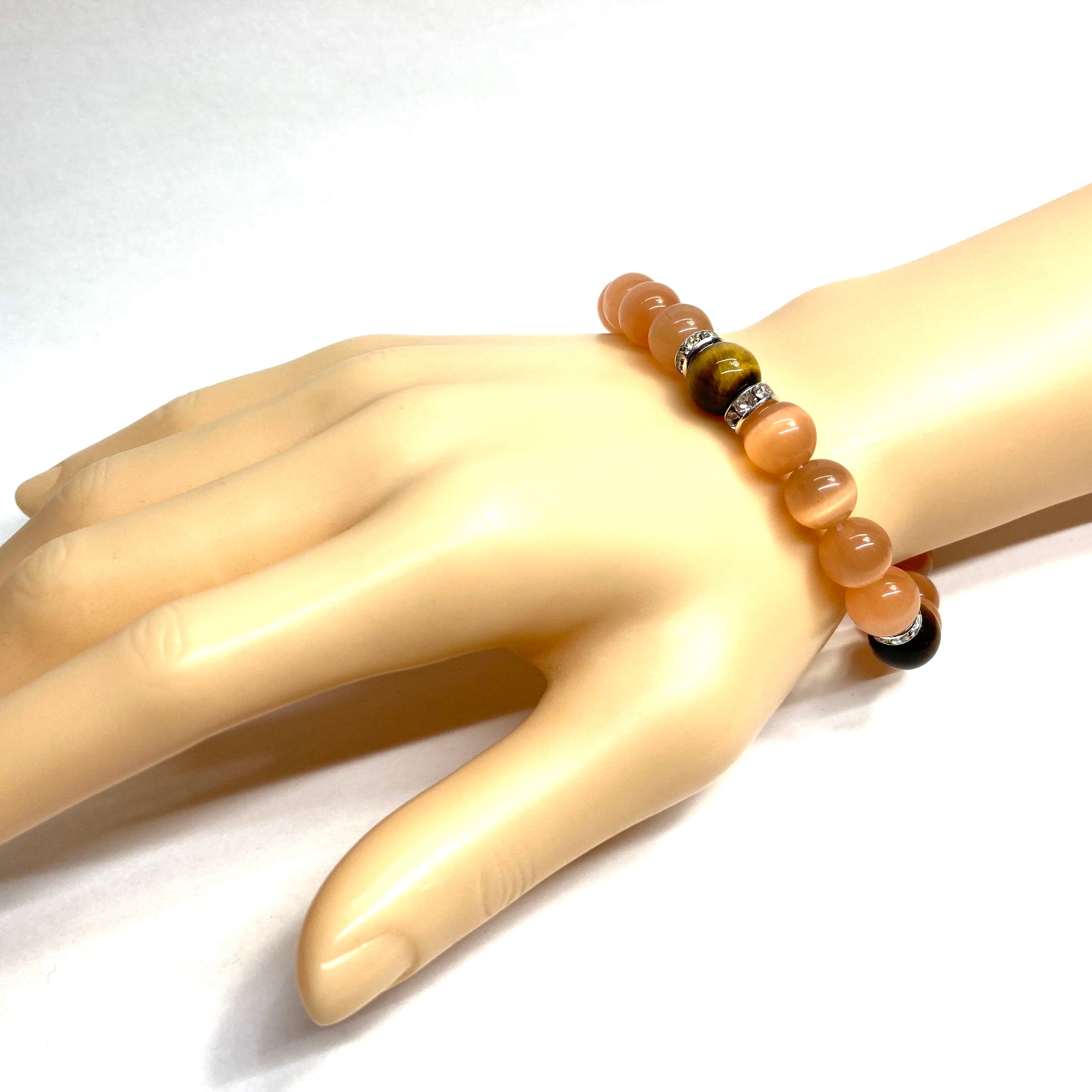 こちらは、キャッツアイとタイガーアイを組み合わせたブレスレットです。間にはロンデルを挟み高級感あるデザインに仕上がっています。石大きさは腕にも馴染みやすいように10mm玉で内周約17cm(伸可能)です。数に限りがございますので気になる方はお早めにどうぞ。