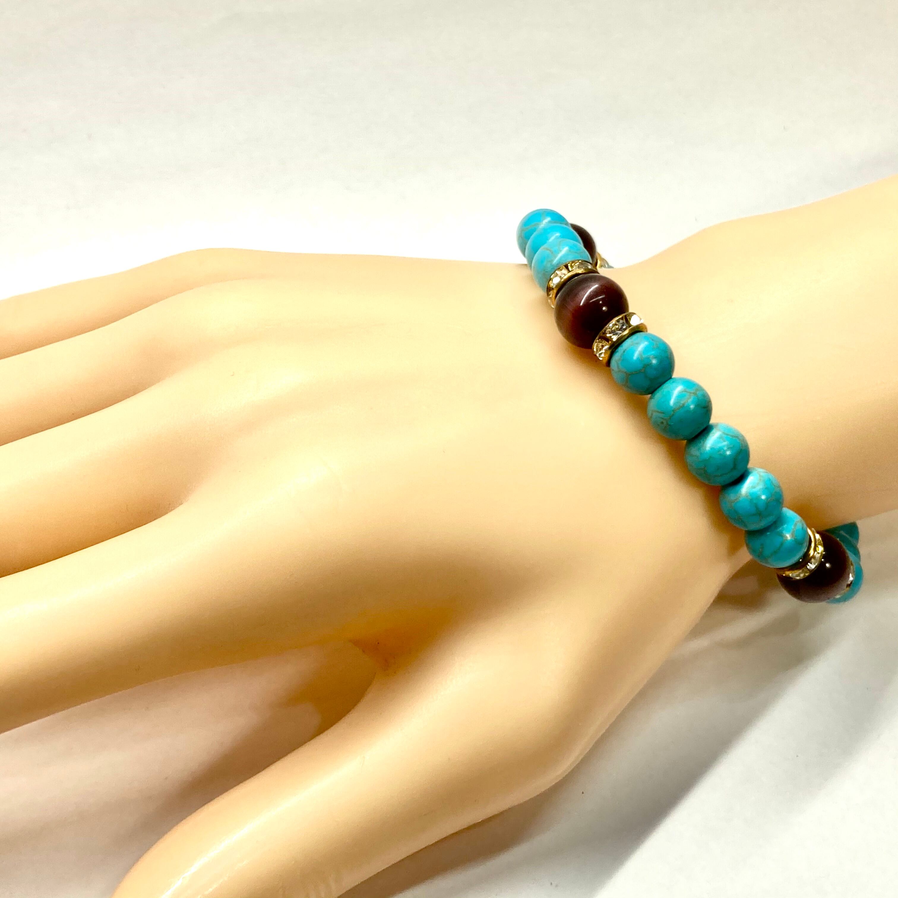 こちらは、8mm玉のキャッツアイとターコイズを使用したパワーストーンブレスレットです。間にはロンデルを挟み高級感ある大人っぽいデザインに仕上がっています。内周約17cmです。気になる方は是非この機会にどうぞ。 【ブレスレット内周サイズ】 内周約17cm 【使用している石、サイズ】 ターコイズ(8mm)・キャッツアイ(10mm) 石は全て浄化済みのものを使っています。