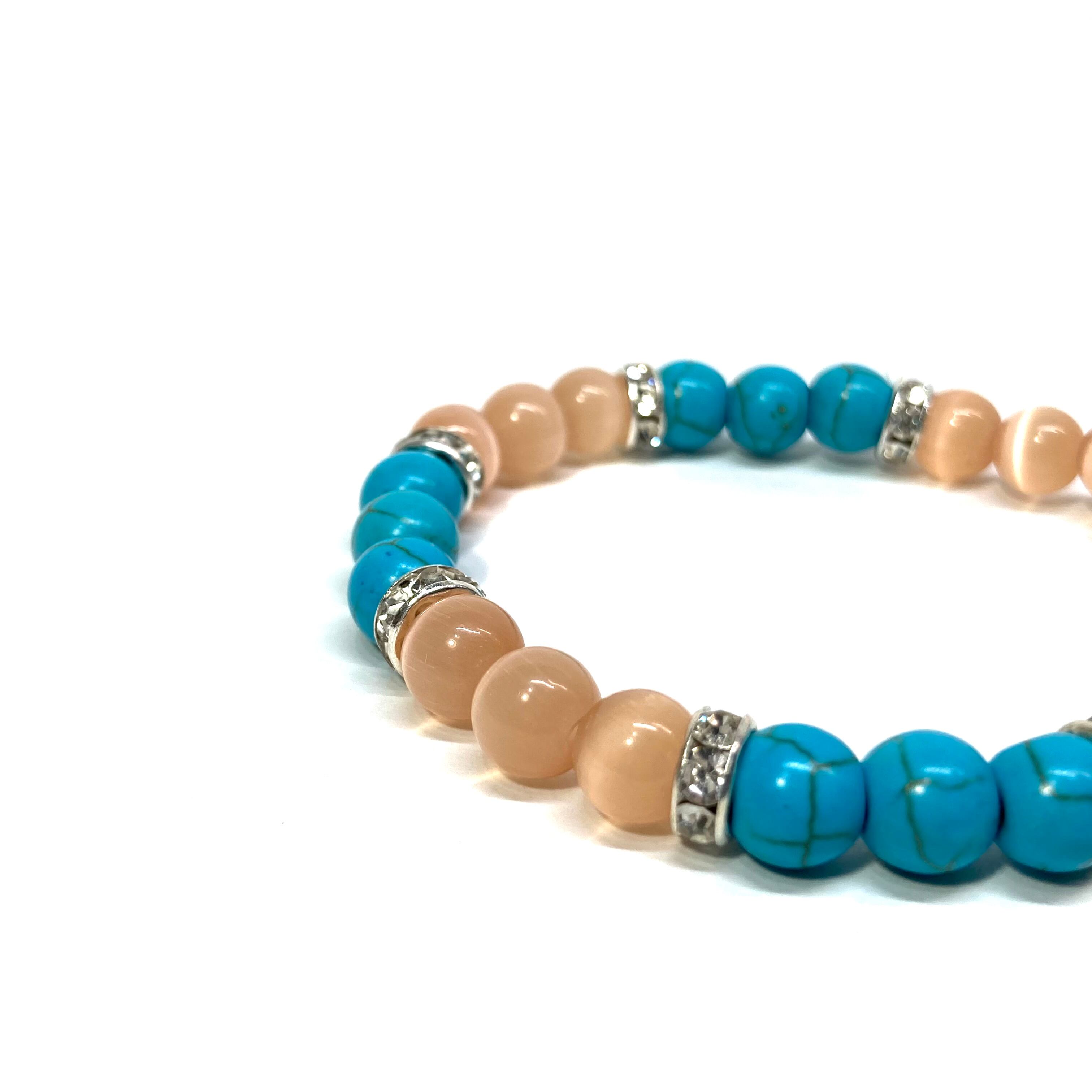こちらは、8mm玉のキャッツアイとターコイズを使用したパワーストーンブレスレットです。間にはロンデルを挟み高級感ある大人っぽいデザインに仕上がっています。内周約16cmです。気になる方は是非この機会にどうぞ。 【ブレスレット内周サイズ】 内周約16cm 【使用している石、サイズ】 ターコイズ(8mm)・キャッツアイ(8mm) 石は全て浄化済みのものを使っています。
