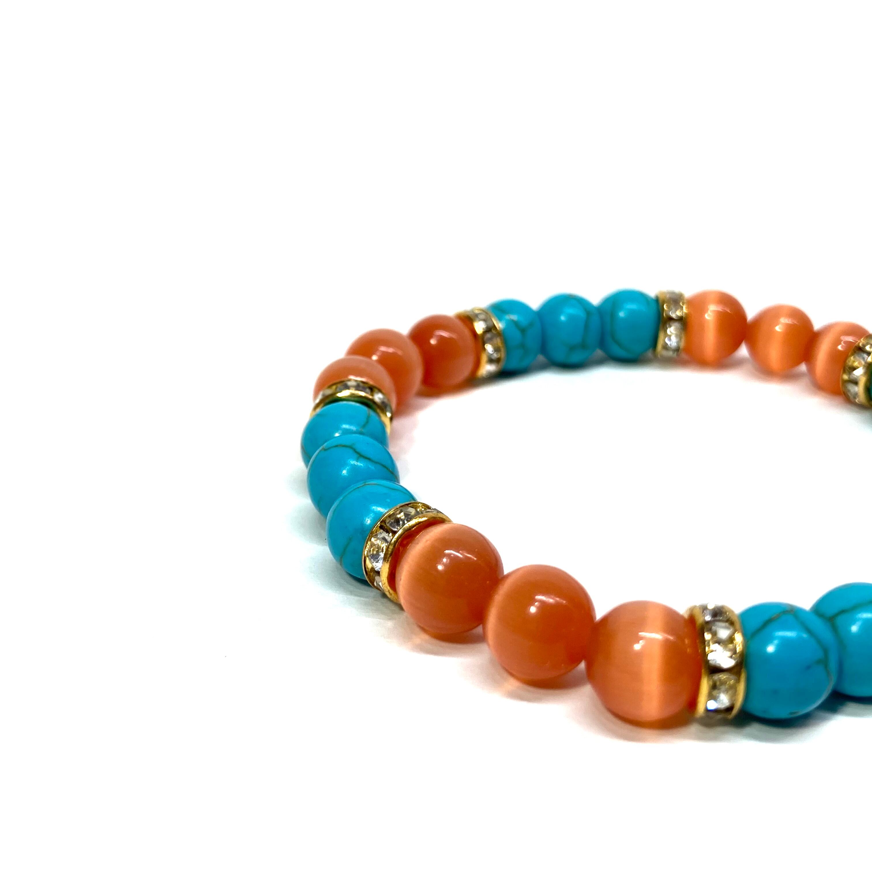 こちらは、8mm玉のキャッツアイとターコイズを使用したパワーストーンブレスレットです。間にはロンデルを挟み高級感ある大人っぽいデザインに仕上がっています。内周約16cmです。気になる方は是非この機会にどうぞ。 【ブレスレット内周サイズ】 内周約16cm 【使用している石、サイズ】 ターコイズ(8mm)・キャッツアイ(8mm) 石は全て浄化済みのものを使っています。