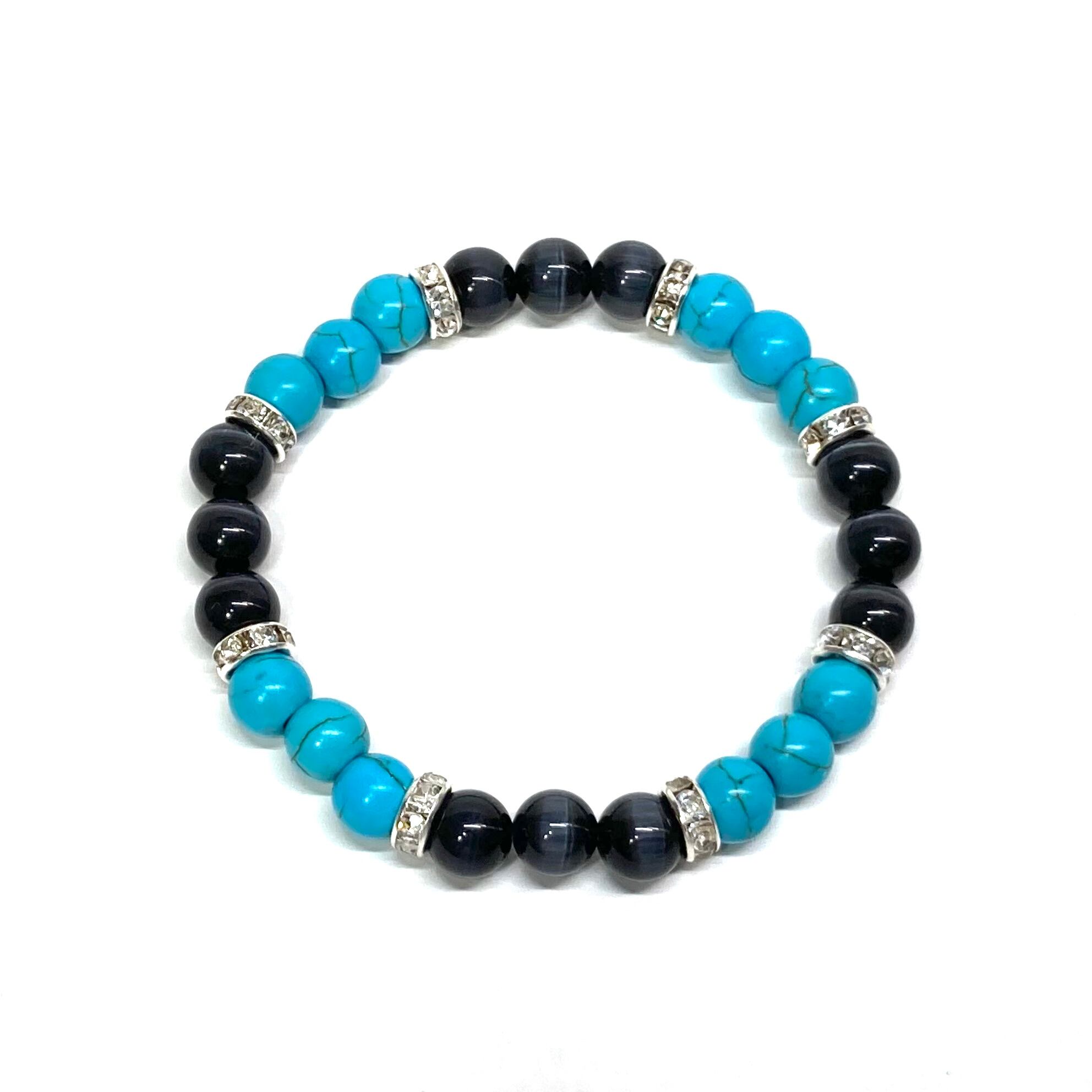 ターコイズ&キャッツアイ(ブラックグレー) パワーストーン ブレスレット (シルバー)メンズ レディース ハンドメイト