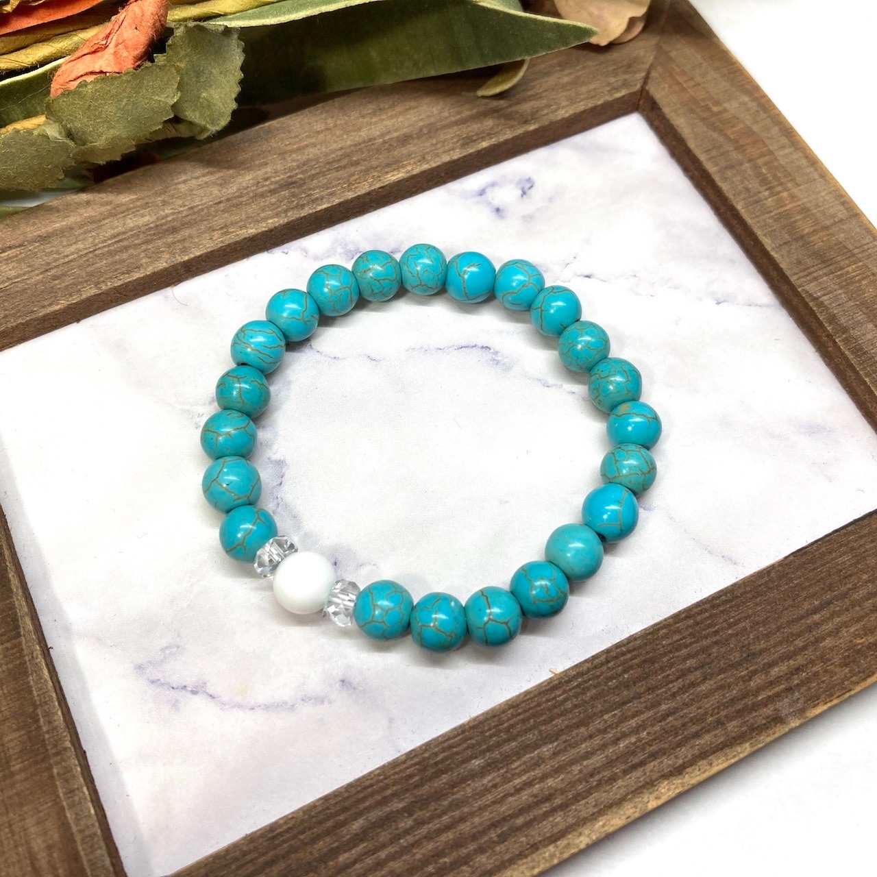 こちらは、ホワイトオニキスとターコイズを組み合わせた一粒ブレスレットです。今回はお買い得プライスにて販売しておりますので是非この機会にどうぞ。(お買い得プライスは予告なく終了する場合がありますのでお早めに!!) 石大きさ8mm玉で基本サイズは内周15cm(サイズ変更は1cmあたり100円で承っております。サイズ変更の場合は金額変更しますのでメッセージにてご連絡くださいませ。)です。