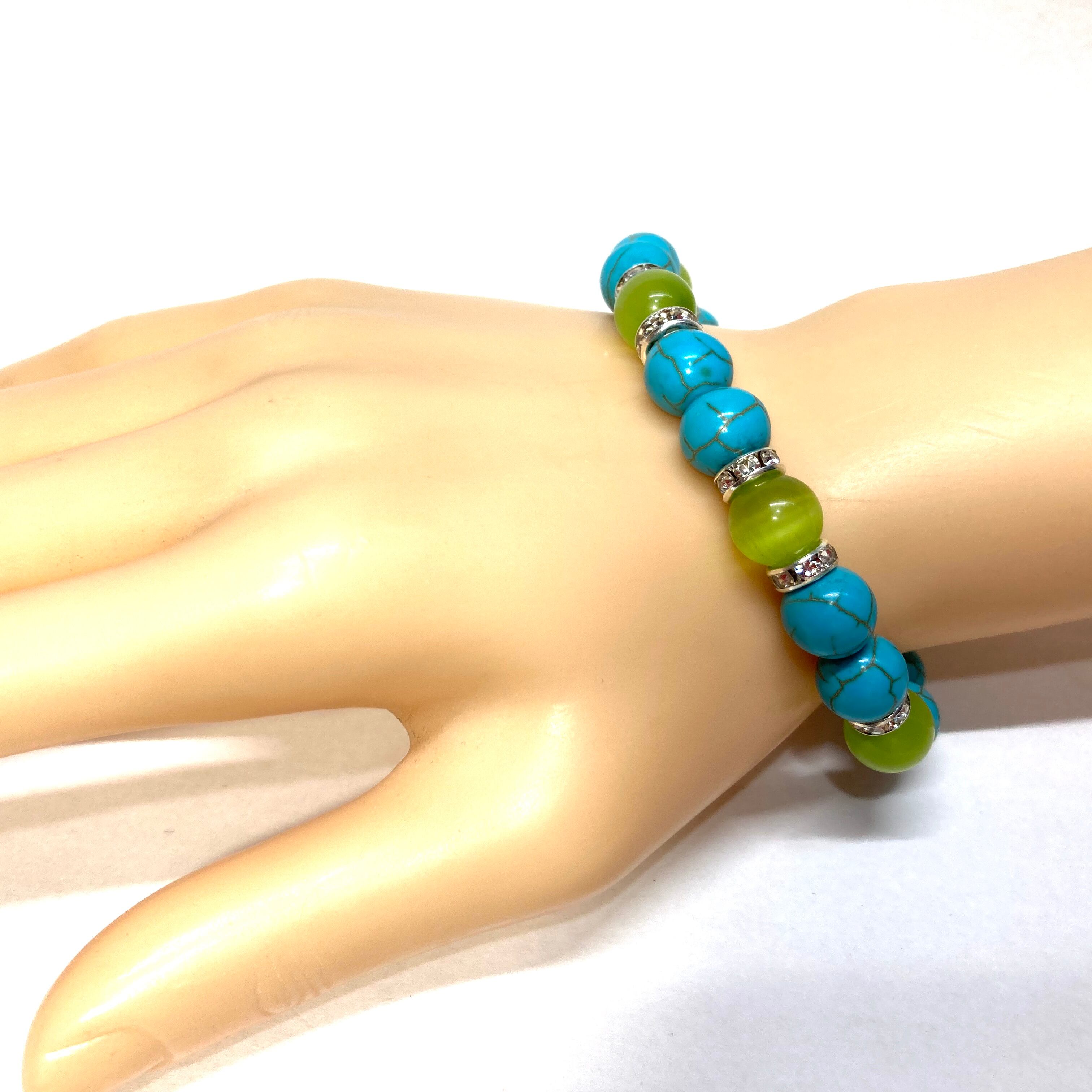 こちらは、キャッツアイとターコイズを組み合わせたブレスレットです。間にはロンデルを挟み高級感あるデザインに仕上がっています。石大きさは腕にも馴染みやすいように10mm玉で内周約16cm(伸可能)です。数に限りがございますので気になる方はお早めにどうぞ。