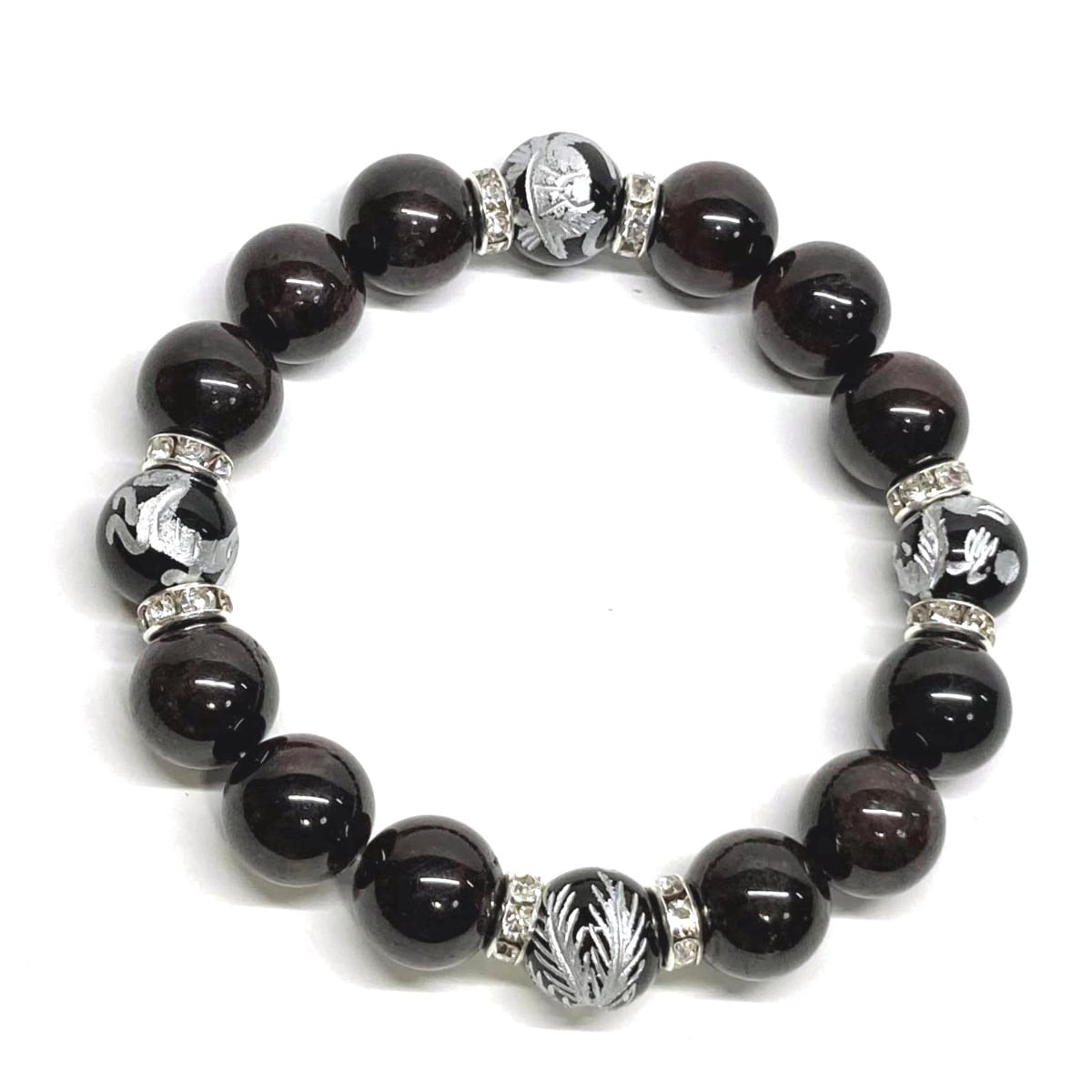 12mm 四神獣銀彫オニキス×ガーネット パワーストーン ブレスレット天然石 運気上昇 開運 恋愛運 お守り 青龍 白虎 玄武 朱雀 1月誕生石 (シルバー)メンズ・レディース 男性・女性 数珠ブレス 開運