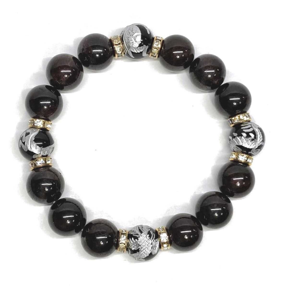 12mm 四神獣銀彫オニキス×ガーネット パワーストーン ブレスレット天然石 運気上昇 開運 恋愛運 お守り 青龍 白虎 玄武 朱雀 1月誕生石 (ゴールド)メンズ・レディース 男性・女性 数珠ブレス 開運