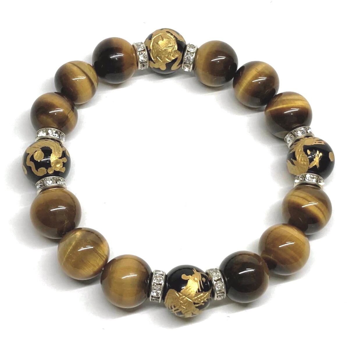 ご覧頂いているブレスレットは、四神獣金彫オニキスとタイガーアイを組み合わせたブレスレット。守り神である四神とパワーストーンの組み合わせで運気の流れを引き寄せる強運ブレスレットです。シンプルなデザインで男女問わず、年齢問わずご使用頂けるデザインなっております。シンプルなデザインは日常のアクセントとして、仕事やビジネスカジュアル、パーティーや特別なイベントなど様々なシーン活用できます。また、ちょっと贈り物にも最適なブレスレットになっております。四神獣を身につけて厄災から身を守り、多くの運気を呼び込まれてください。