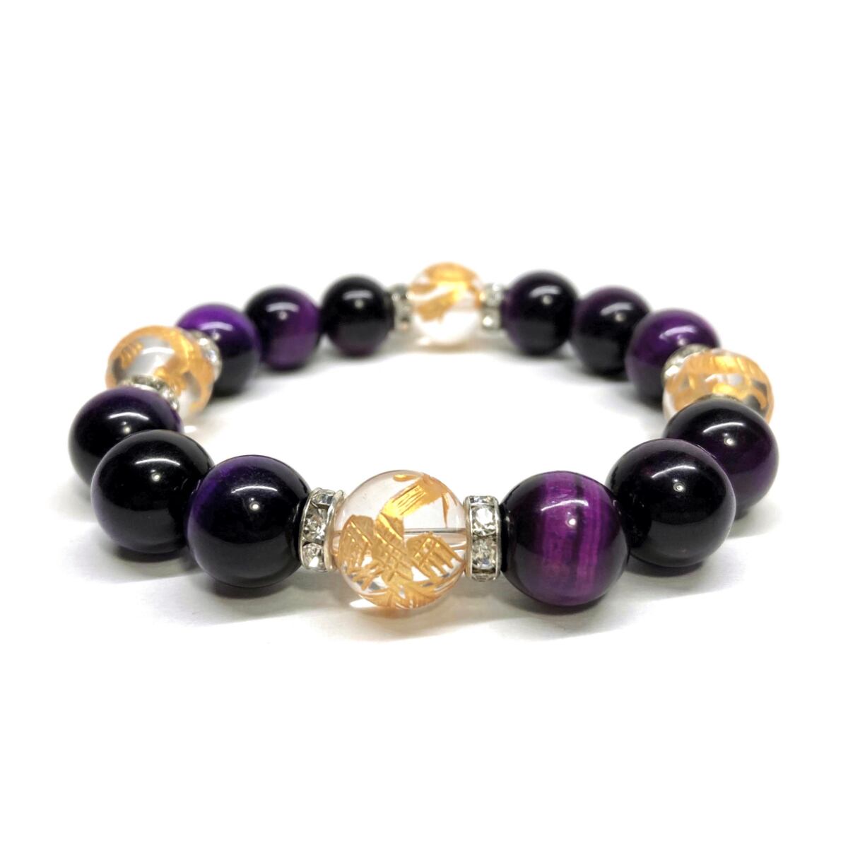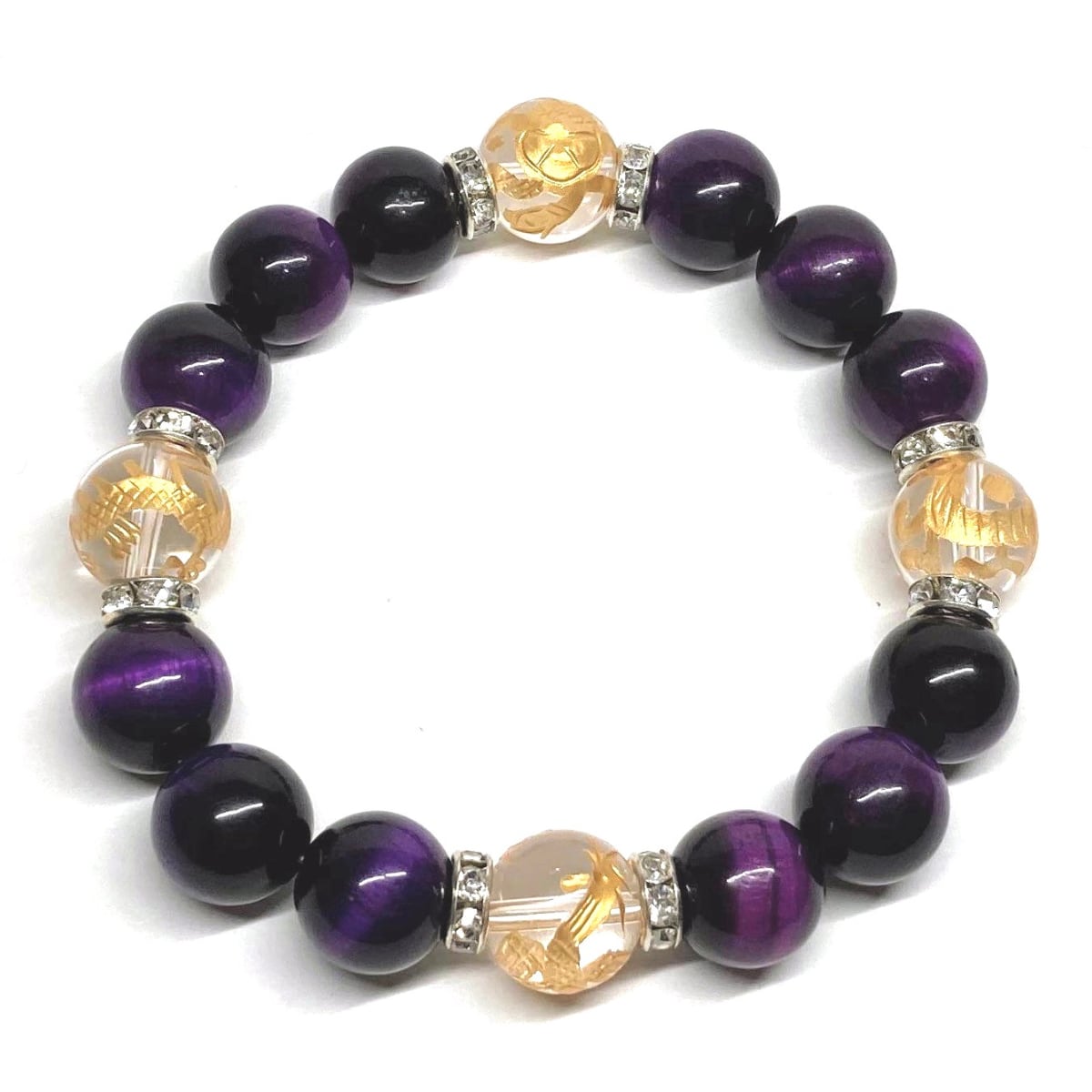 ご覧頂いているブレスレットは、四神獣金彫水晶とパープルタイガーアイを組み合わせたブレスレット。守り神である四神とパワーストーンの組み合わせで運気の流れを引き寄せる強運ブレスレットです。シンプルなデザインで男女問わず、年齢問わずご使用頂けるデザインなっております。シンプルなデザインは日常のアクセントとして、仕事やビジネスカジュアル、パーティーや特別なイベントなど様々なシーン活用できます。また、ちょっと贈り物にも最適なブレスレットになっております。四神獣を身につけて厄災から身を守り、多くの運気を呼び込まれてください。