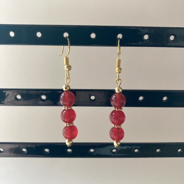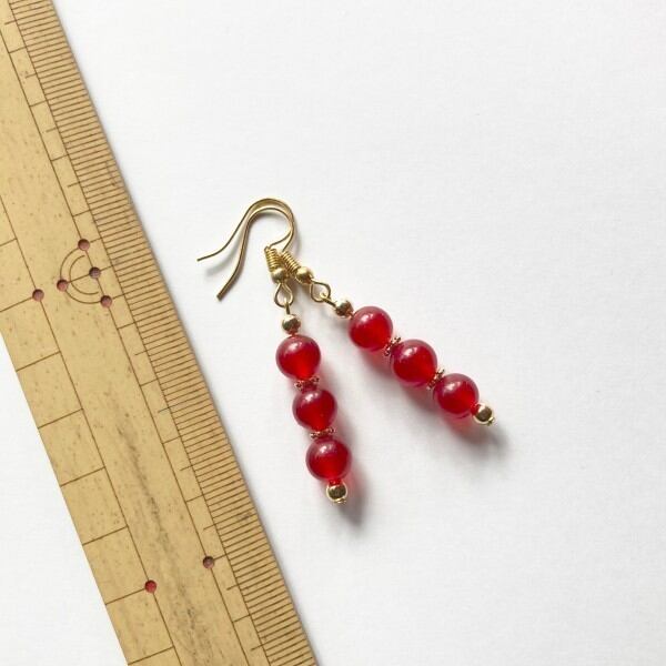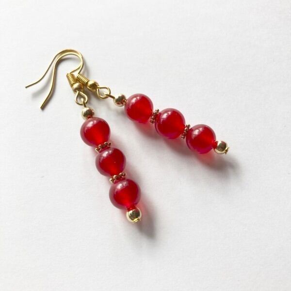 こちらは、8mm玉のレッドジェイドジェイドを3個並べたフックピアスです。シンプルなデザインですのでコーディネートにも合わせやすいデザインで、使い勝手がいいアイテムとなっております。気になる方は是非この機会にどうぞ。