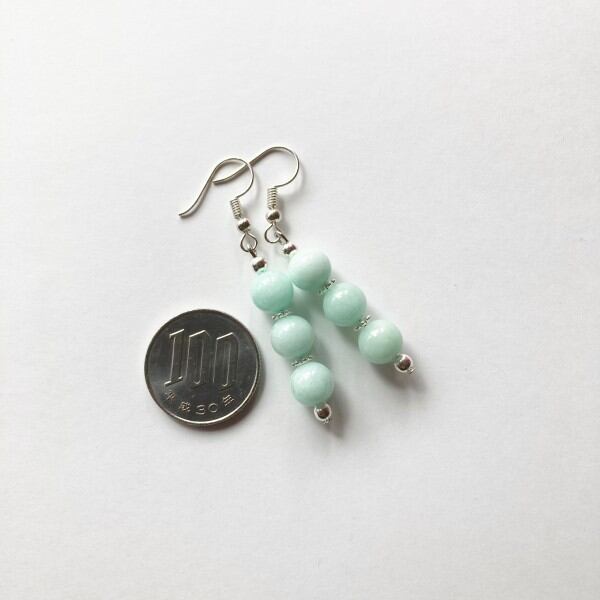 こちらは、8mm玉のブルーグリーンジェイドジェイドを3個並べたフックピアスです。シンプルなデザインですのでコーディネートにも合わせやすいデザインで、使い勝手がいいアイテムとなっております。気になる方は是非この機会にどうぞ。