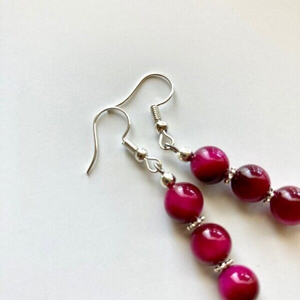 こちらは、8mm玉のピンクタイガーアイを3個並べたフックピアスです。当ギャラリーの中で群を抜いて人気のピンクタイガーアイ、なによりもこのマゼンダピンクカラーが人気で女性の可愛らしさを引き立ててくれるピアスになっております。コーディネートにも合わせやすいデザインで、使い勝手がいいアイテムとなっております。気になる方は是非この機会にどうぞ。