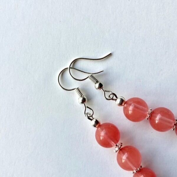 こちらは、8mm玉を使用したチェリークォーツのフックピアスです。どんなコーディネートとも合わせやすい様にシンプルなデザインで制作。シンプルなデザインは飽きがこないのでシーズン問わず使える事間違い無しのアイテムです。上品な印象で耳元を華やかに飾ってくれるアイテムですので気になる方は是非この機会にどうぞ。