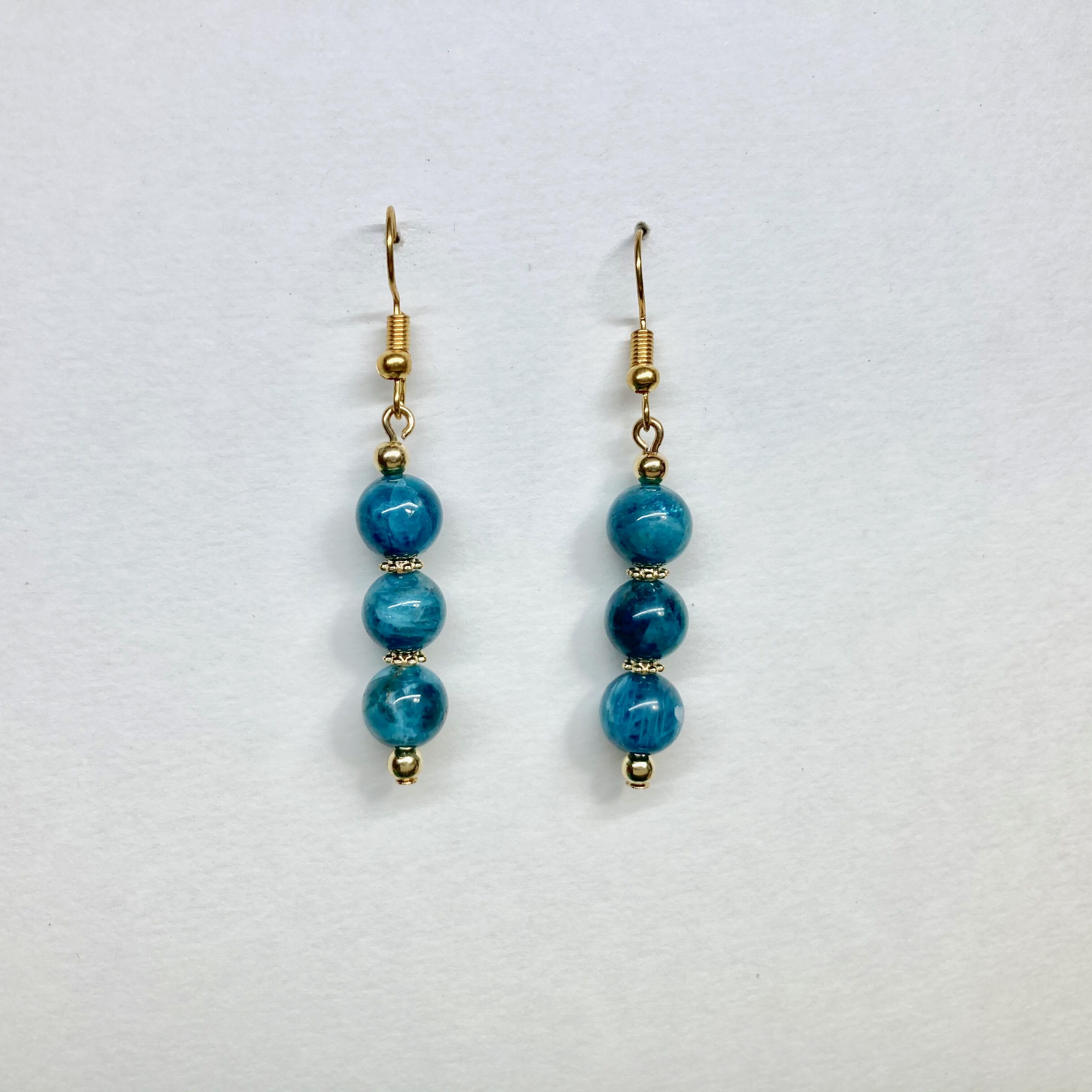 こちらは、8mm玉を使用したアパタイトのフックピアスです。どんなコーディネートとも合わせやすい様にシンプルなデザインで制作。シンプルなデザインは飽きがこないのでシーズン問わず使える事間違い無しのアイテムです。上品な印象で耳元を華やかに飾ってくれるアイテムですので気になる方は是非この機会にどうぞ。